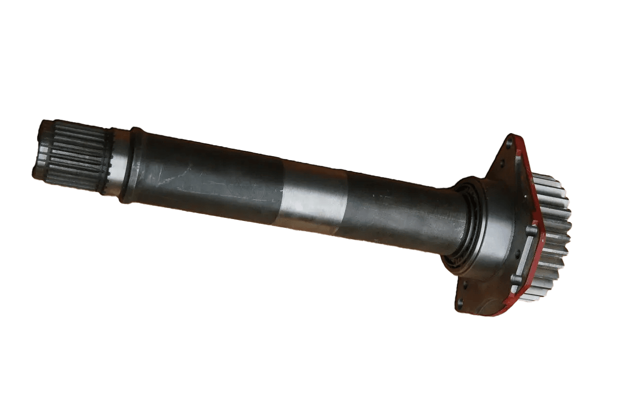 Конструкция вала выполнена из высокопрочной закалённой стали с точной механической обработкой шлицевых соединений и посадочных мест. Это обеспечивает надёжную передачу крутящего момента, минимальные люфты и точную центровку с другими элементами трансмиссии. Вал рассчитан на работу в тяжёлых условиях, выдерживая повышенные нагрузки при тяговых операциях, маневрировании и работе с навесным оборудованием.